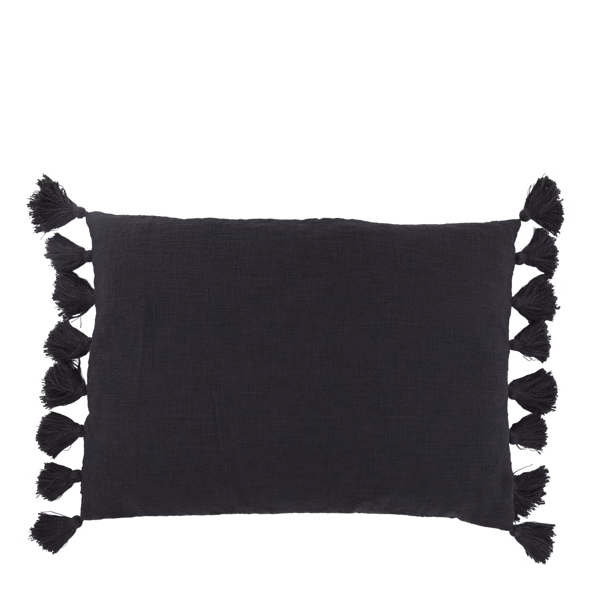 Ge din soffa eller säng en sofistikerad och modern uppgradering med detta vackra kuddfodral i en djup svart nyans. Fodralet kombinerar en rustik vävd struktur med generösa, handknutna tofsar längs kortsidorna, vilket skapar en perfekt balans mellan det enkla skandinaviska och den bohemiska "chic"-stilen.