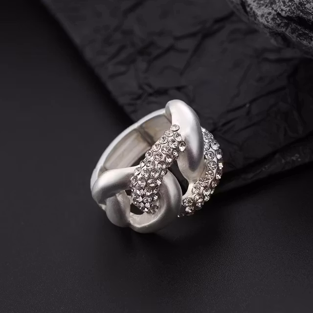 Denna ring är inte bara ett smycke; det är en kraftfull deklaration av stil. Med Glöd på ditt finger, bär du en stråle av ljus som fångar ögat och reflekterar din inre lyster. Ett band av gnistrande strasstenar löper snett över ringen, skapandes en oemotståndlig effekt som både är elegant och vågad.