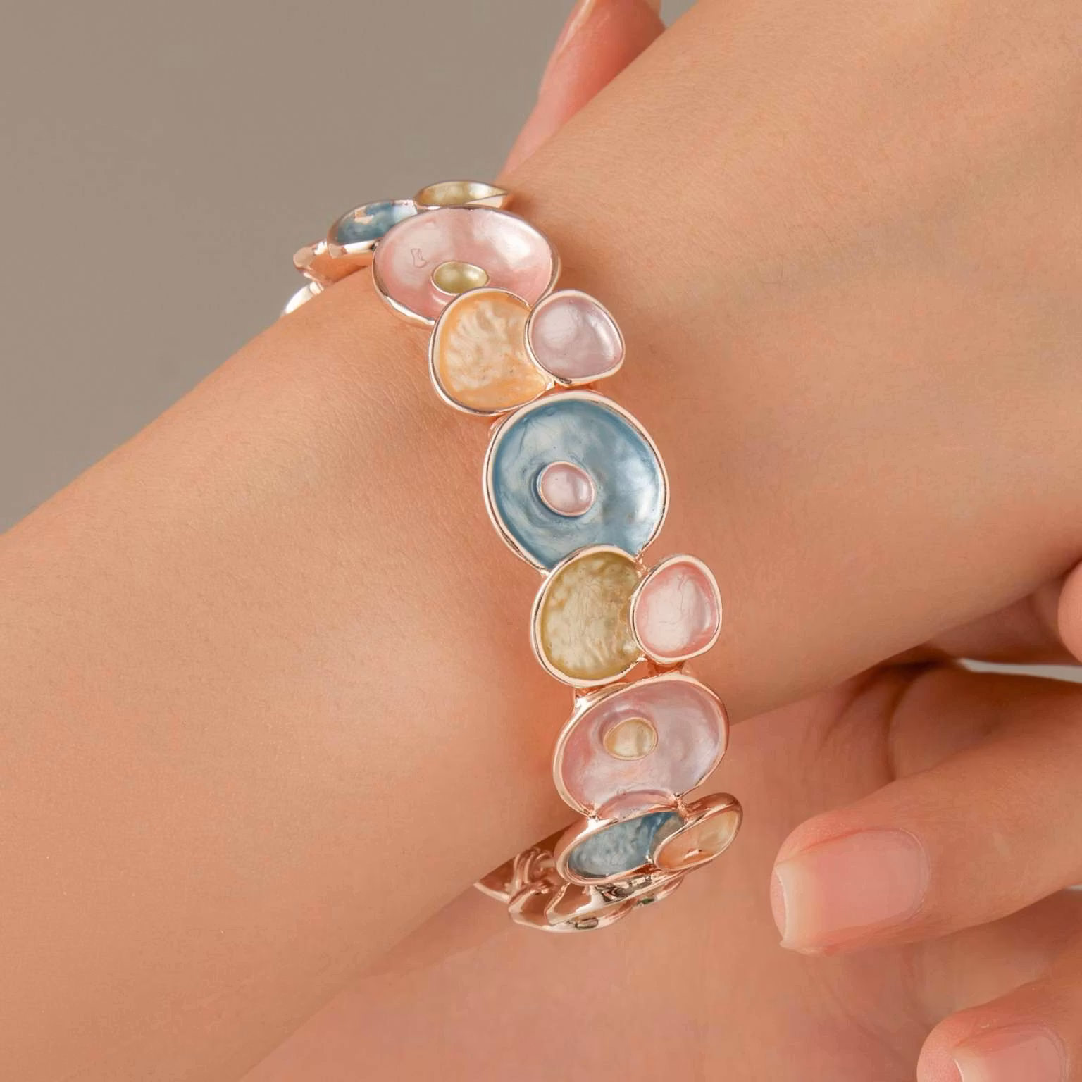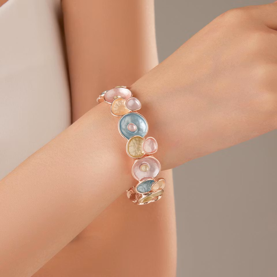Vårt nya armband My Farytail är en sagolik dröm. Det färgsprakande smycket är en riktig färgprakt runt din handled och är lätt att matcha till din outfit tack vare det gedigna färgspektrat. Här möts du av härliga toner av rosa, blå, gult och grönt innesluten av roseguld. Armbandet är tillverkat för att passa de flesta handleder och är tack vare sin unika design enkelt att ta på. Köp det till dig själv, kollegan på jobbet eller varför inte en kär vän? Designen är lika elegant som modern och My Farytail är bara en i raden av vår nya kollektion med emaljerade smycken. Levereras i en smyckespåse eller presentförpackning.