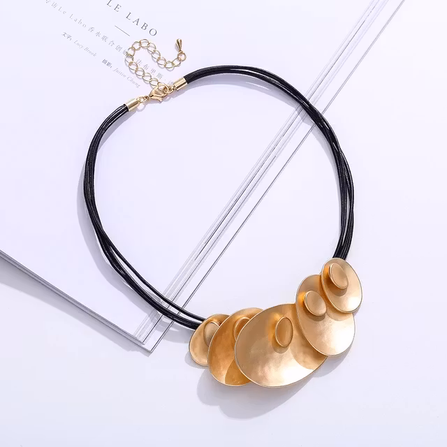 Upptäck Halsband Labo Guld - en kraftfull stilförklaring som inte lämnar någon oberörd. Detta halsband kombinerar det råa och sofistikerade med ett svart läderband som grund, vilket ger en perfekt kontrast till de fem gyllene brickorna i varierande storlekar. Varje bricka är designad med geometriska former för att skapa ett unikt och iögonfallande mönster som fångar ljuset och blickarna.